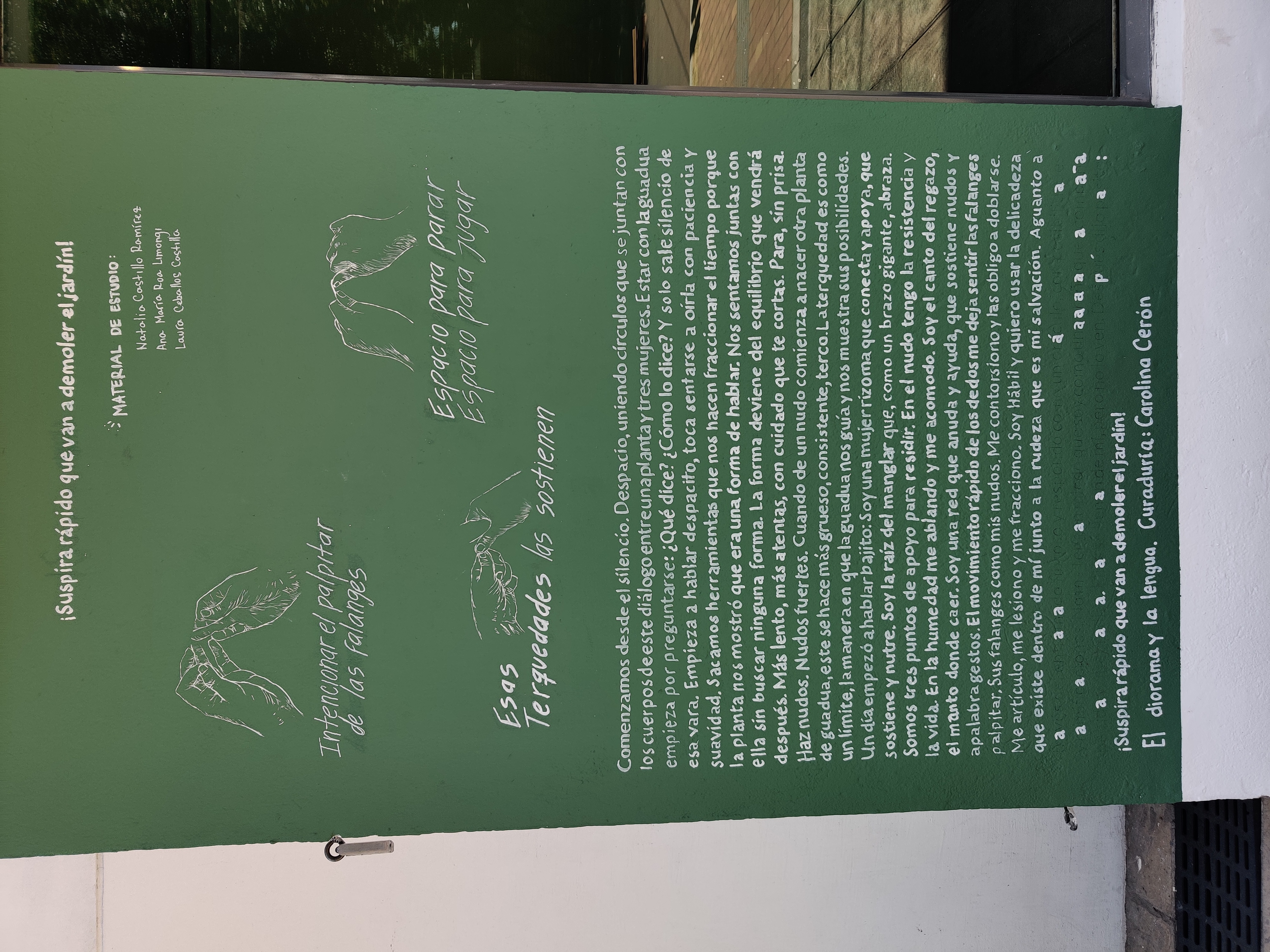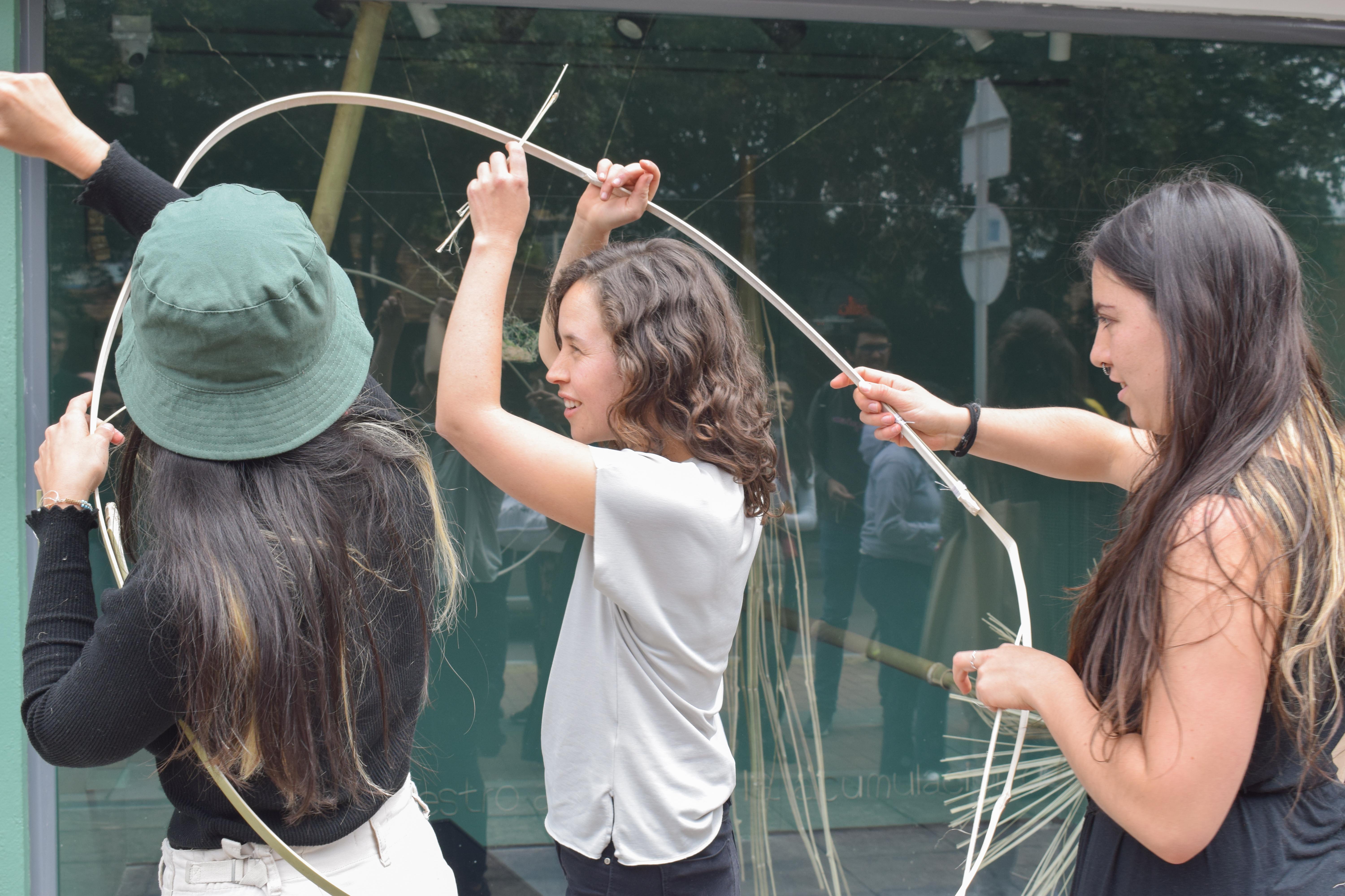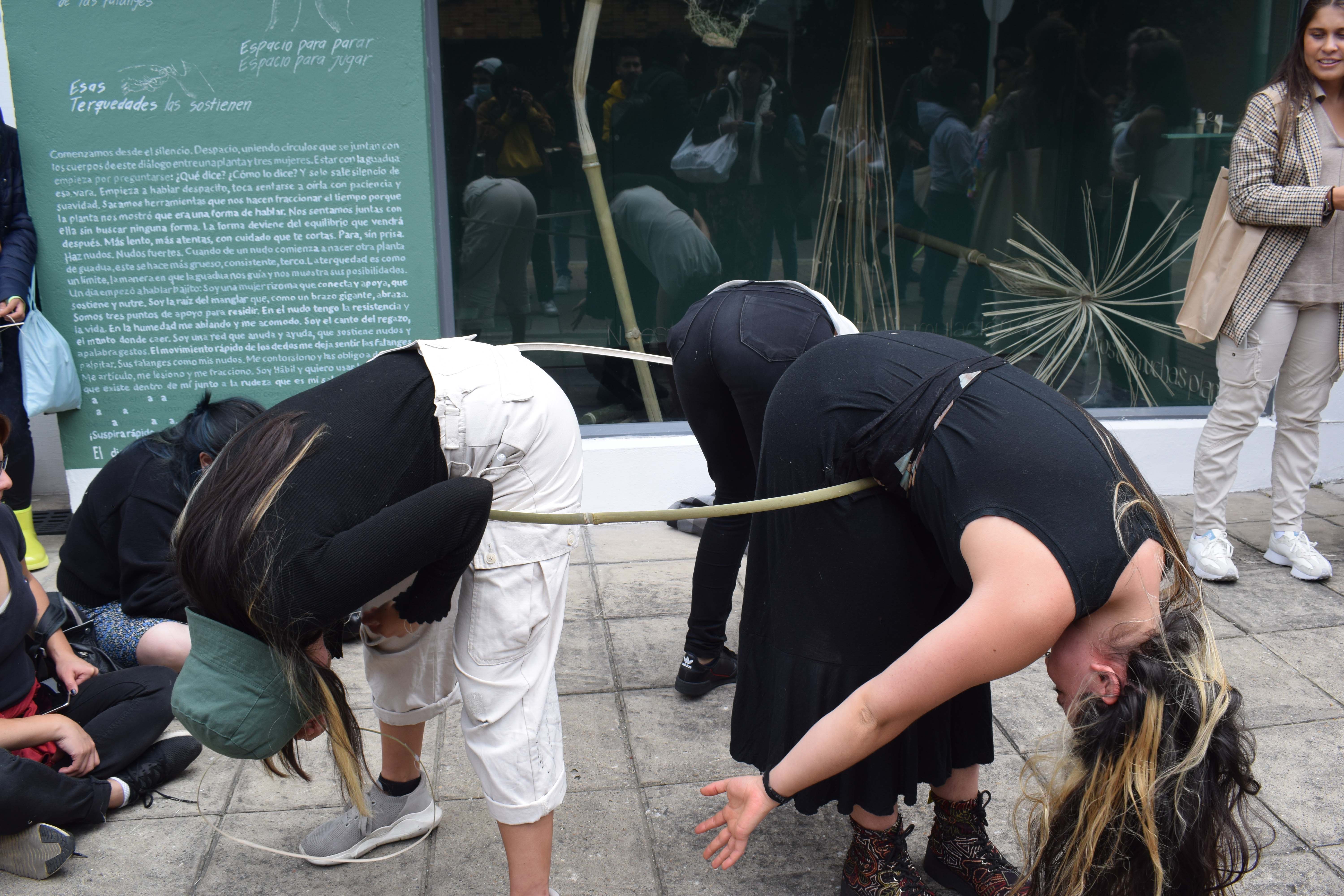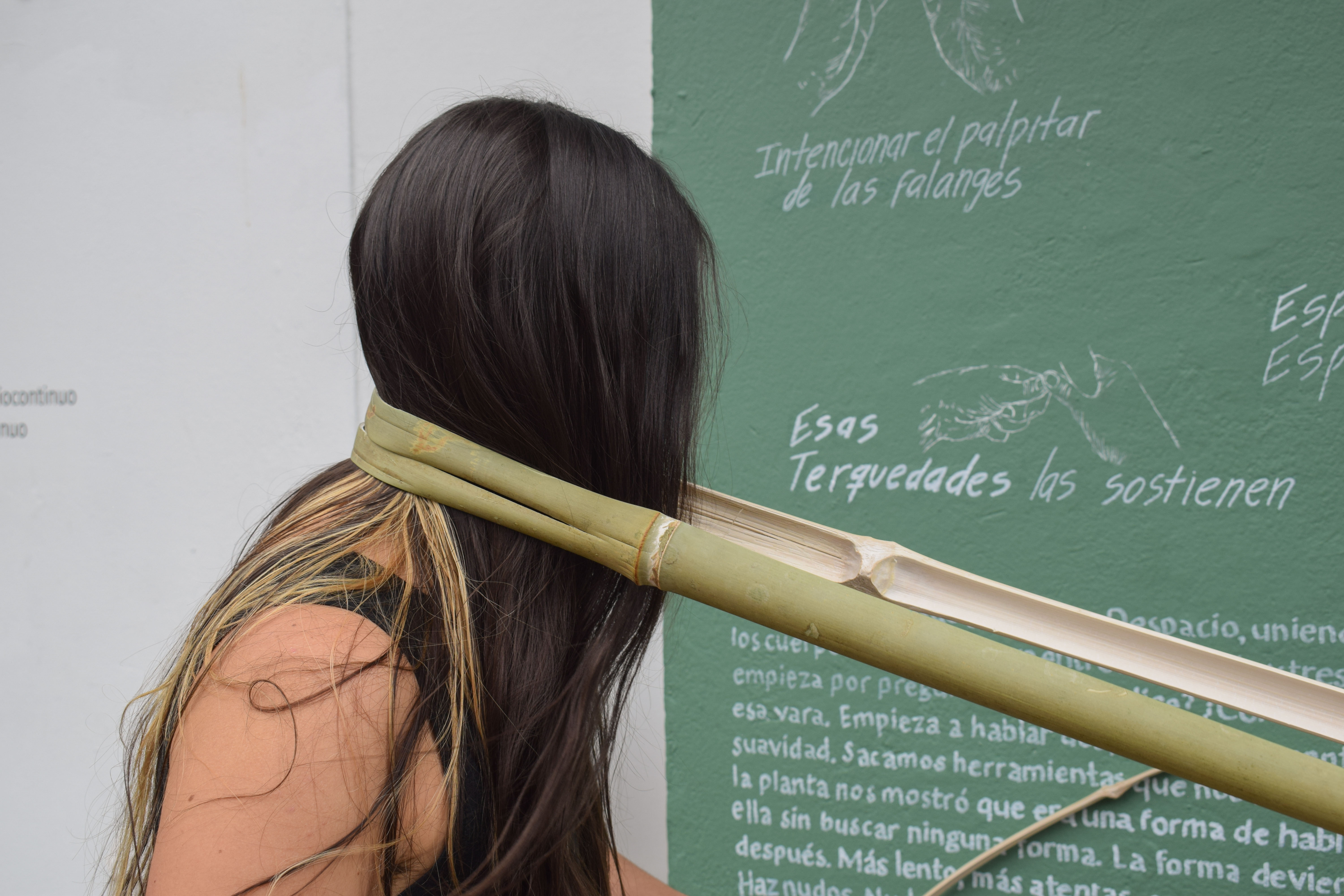 Comenzamos desde el silencio. Despacio, uniendo círculos que se juntan con los cuerpos de este diálogo entre una planta y tres mujeres. Estar con la guadua empieza por preguntarse: ¿Qué dice? ¿Cómo lo dice? Y solo sale silencio de esa vara. Empieza a hablar despacito, toca sentarse a oírla con paciencia y suavidad. Sacamos herramientas que nos hacen fraccionar el tiempo porque la planta nos mostró que era una forma de hablar. Nos sentamos juntas con ella sin buscar ninguna forma. La forma deviene del equilibrio que vendrá después. Más lento, más atentas, con cuidado que te cortas. Para, sin prisa. Haz nudos. Nudos fuertes. Cuando de un nudo comienza a nacer otra planta de guadua, este se hace más grueso, consistente, terco. La terquedad es como un límite, la manera en que la guadua nos guía y nos muestra sus posibilidades. Un día empezó a hablar bajito: Soy una mujer rizoma que conecta y apoya, que sostiene y nutre. Soy la raíz del manglar que, como un brazo gigante, abraza. Somos tres puntos de apoyo para residir. En el nudo tengo la resistencia y la vida. En la humedad me ablando y me acomodo. Soy el canto del regazo, el manto donde caer. Soy una red que anuda y ayuda, que sostiene nudos y apalabra gestos. El movimiento rápido de los dedos me deja sentir las falanges palpitar. Sus falanges como mis nudos. Me contorsiono y las obligo a doblarse. Me artículo, me lesiono y me fracciono. Soy hábil y quiero usar la delicadeza que existe dentro de mí junto a la rudeza que es mi salvación. Aguanto a través del entramado fibroso y respondo como un oráculo, con posibilidades y ramificaciones. No me tengan miedo que soy como una araña que acompaña peluda y quebradiza. Ellas se llenan de mí, pero no lo ven. Después dijo pasito: ¡Suspira rápido que van a demoler el jardín!